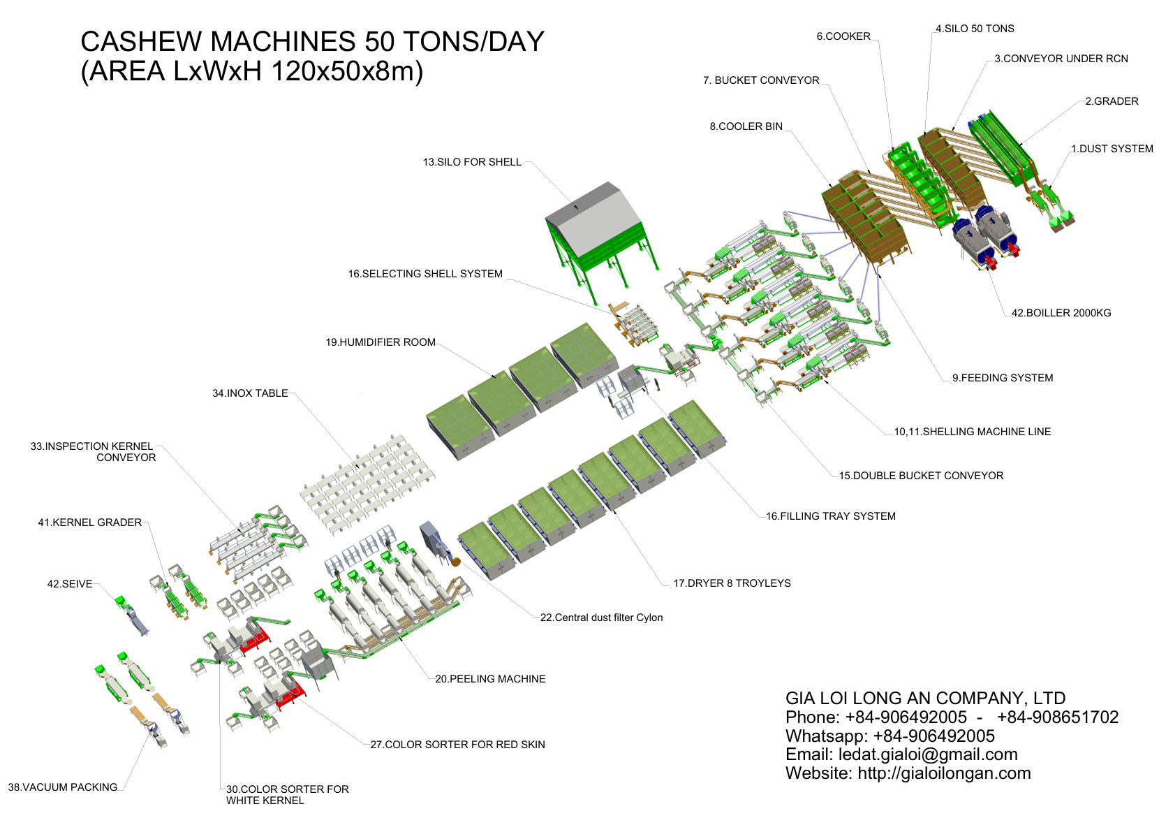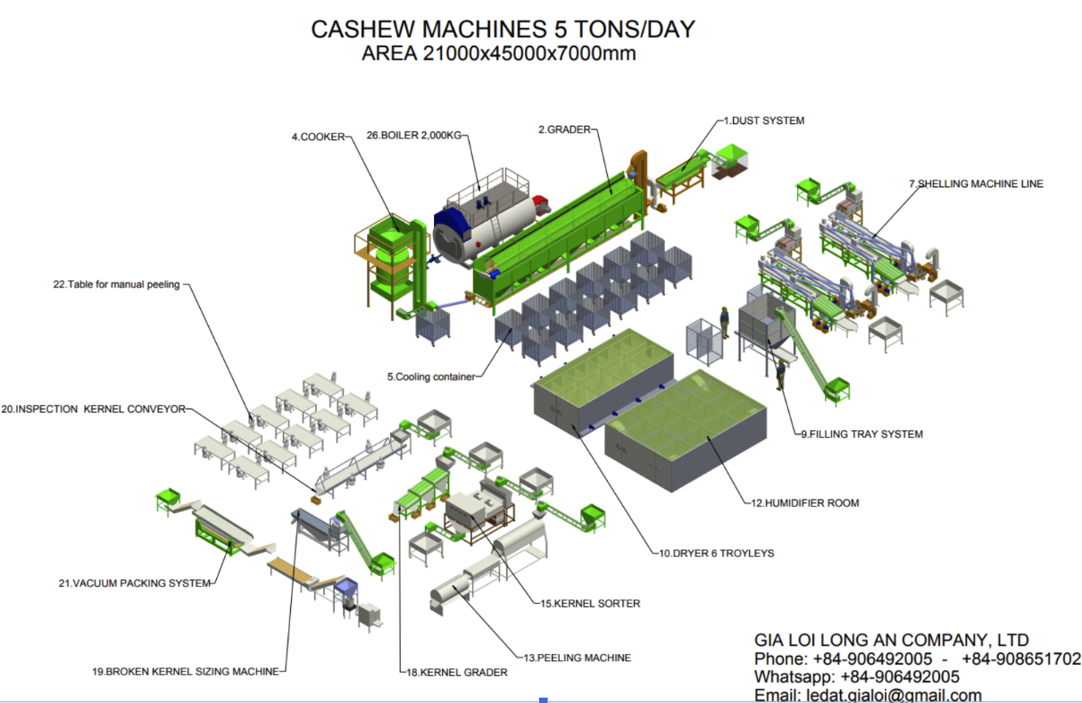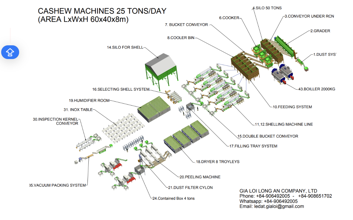 The above image illustrates the modern cashew processing machine system provided by Gia Loi Long An, with a design capacity of 25 tons/day in a standard factory area of 60m x 40m x 8m.