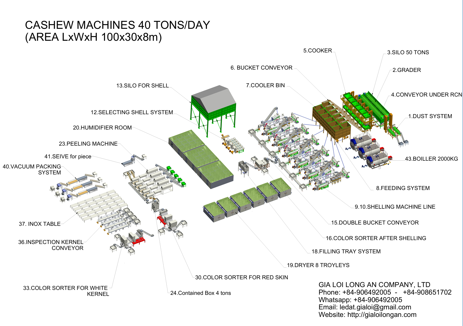 The 40 tons/day cashew nut processing machine system is designed in an area of 100m x 30m x 8m, suitable for large-scale factories, aiming at industrial export.